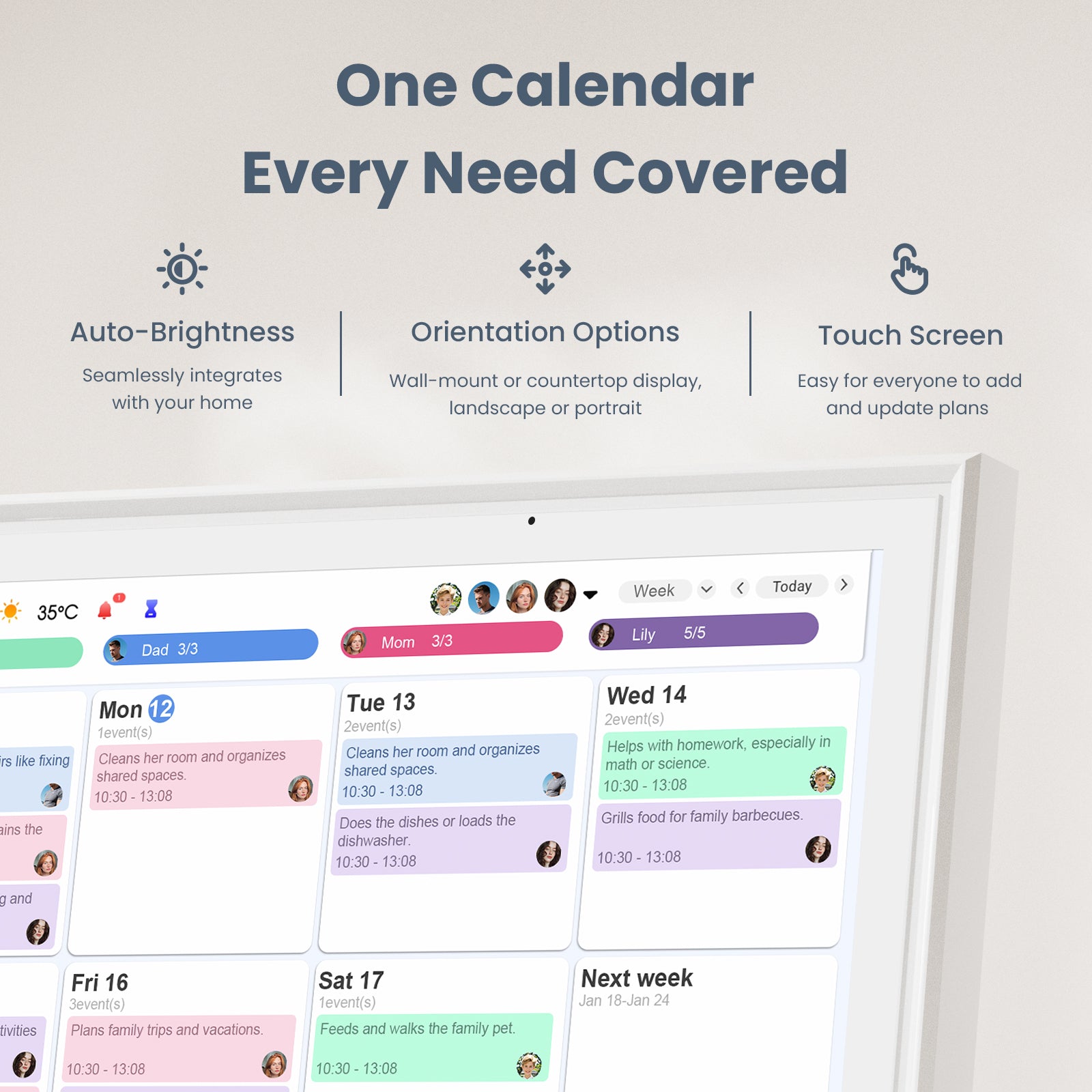 Designed for modern families, this digital calendar brings everything together in one intuitive 15.6" HD display. Combines calendar syncing, chore charts, routines, to-do lists, meal planning, a reward system, and a multi-user color system — no subscription required.
